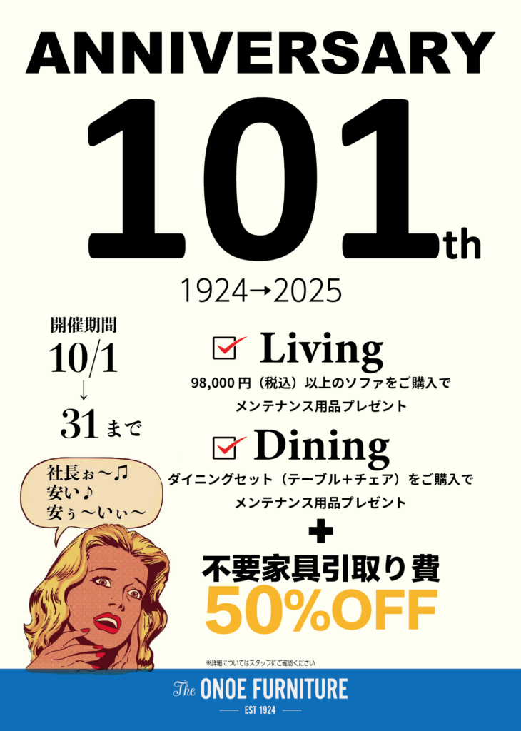2025.09.30 10月31日(金)まで!101周年キャンペーン開催!リビングorダイニング購入でお得なプレゼント!さらに不要家具引取料50%OFF